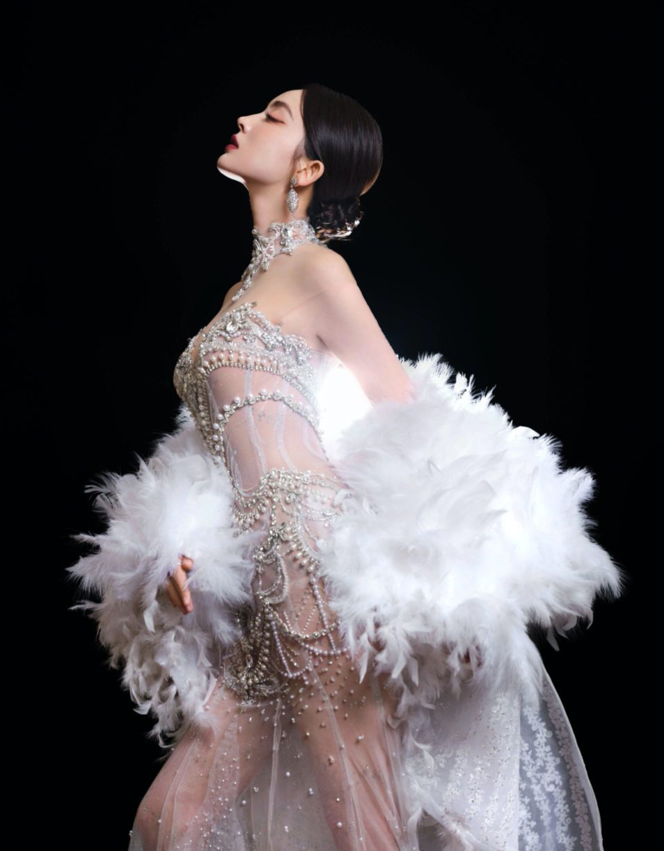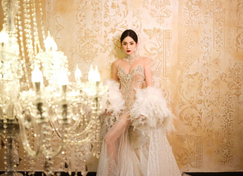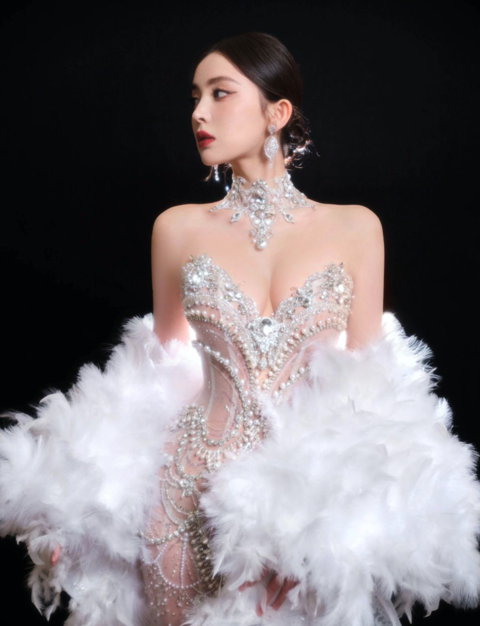 身材曼妙的她,宛若舞池中的优美舞者,尽情绽放光彩。白皙礼服长裙在灯光映射下熠熠生辉,优雅气质一览无余。