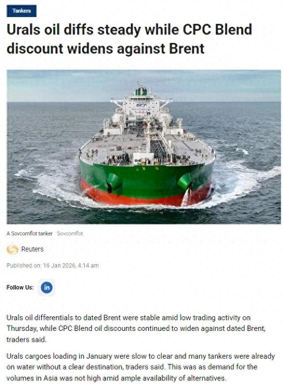 根据航运网站bairdmaritime报道,一艘名为'格罗玛什'号(Gromash)的超大型油轮(VLCC)已在锚地漂了18天。日志显示,这艘装载乌拉尔原油(Urals)的油轮原定驶往印度,却迟迟未收到最终卸货指令。它并非孤例——多名交易员透露,2026年1月装运的乌拉尔原油货盘出清缓慢,大量油轮'已在水上'却无明确目的地,被动成为海上石油浮储。