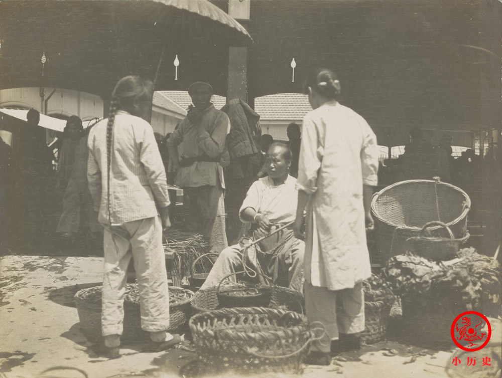 1908年,上海街头的菜市场,女摊贩正常称重。