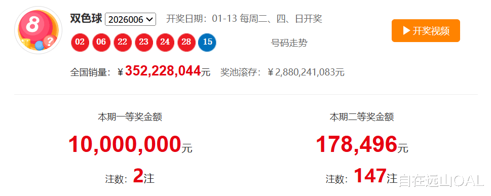 开奖号码: 红球 02 06 22 23 24 28 + 蓝球 15