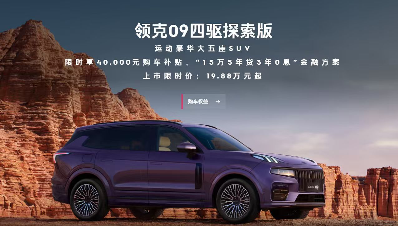 限时19.88万的价格,放在一台中大型四驱SUV上,确实很有冲击力。这个价位过去可能只能买到合资品牌的紧凑型SUV,或者配置抠抠搜搜的中低配车型。而2026款领克09四驱探索版直接把行政级二排、全时四驱和SPA架构的安全基础一起打包给你,这种“质价比”策略,明显是冲着务实派用户来的。