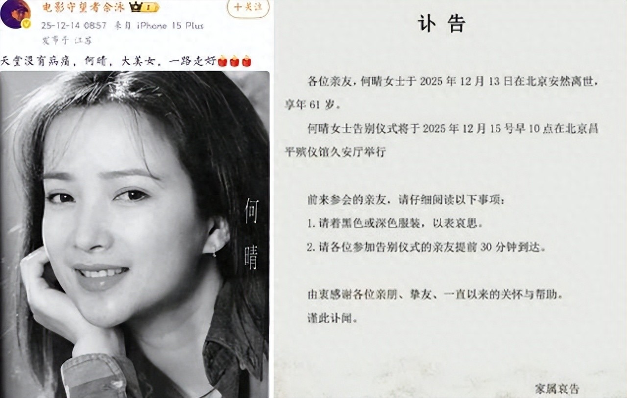 何晴于2025年12月13日在北京离世,此消息通过家属发布的讣告于次日传开。讣告中提到离世时间为当天上午,家属选择在小范围内分享信息,避免对外公开接受采访,以维护其形象。追悼会安排在2025年12月15日上午于北京昌平殡仪馆一处厅堂举行,仪式保持低调,仅限亲友参与,不对外开放吊唁。家属在讣告中表达了对逝者的缅怀,并感谢各界关心。