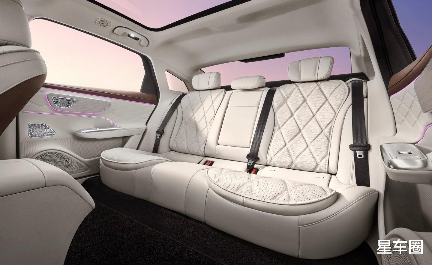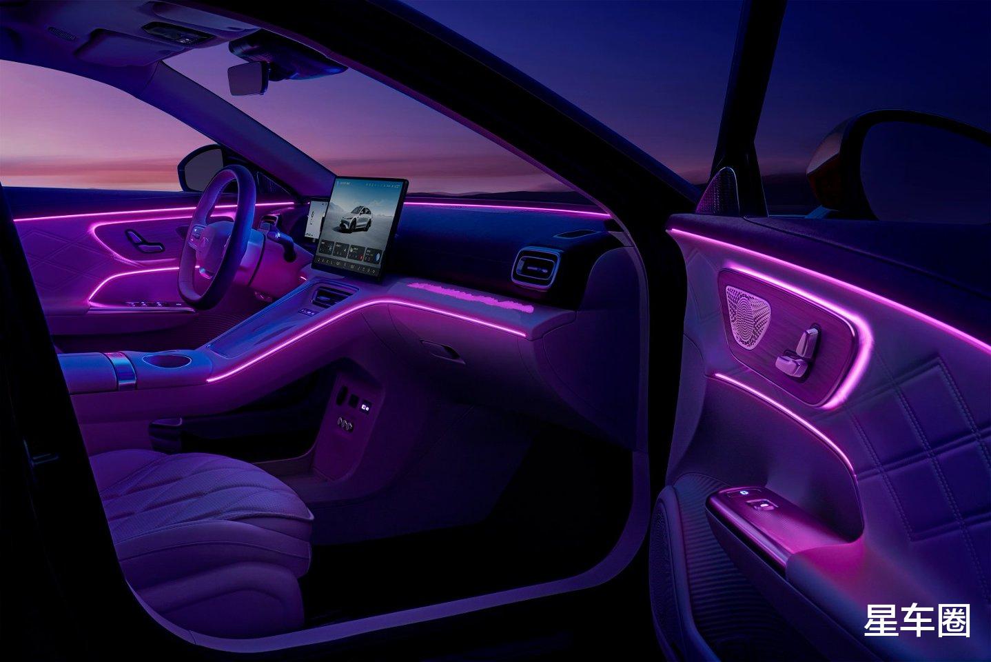 最绝的是它的豪华感!车长超5米、轴距3米,后排空间宽敞到能跷二郎腿,膝盖离前排还有165毫米,横向空间也够大,坐三个人都不挤。副驾的零重力座椅简直是宝藏,躺上去腰部腿部都能放松,跑长途再也不怕累了。还有长达13米多的氛围灯,256种颜色随便调;更有23个扬声器遍布全车,内饰面板灵感来自《千里江山图》,灯光一照特别有质感,伴随音乐环绕,行驶途中氛围感拉满。