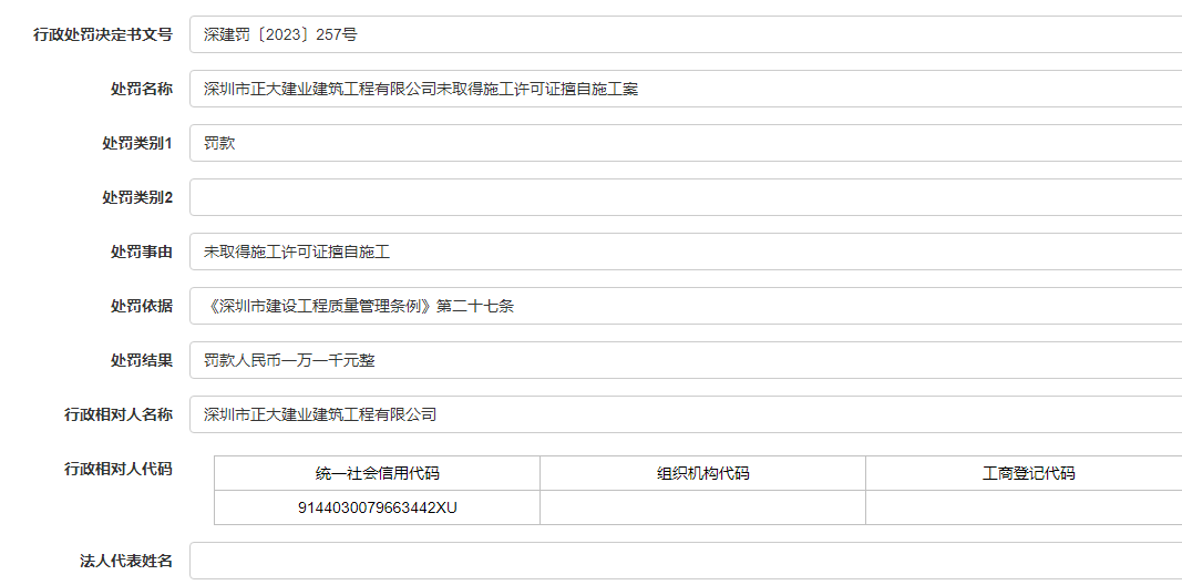 深圳市住房和建设局近日公布了对深圳市正大建业建筑工程有限公司的行政处罚决定。该公司因未取得施工许可证擅自施工,被罚款人民币一万一千元整。
