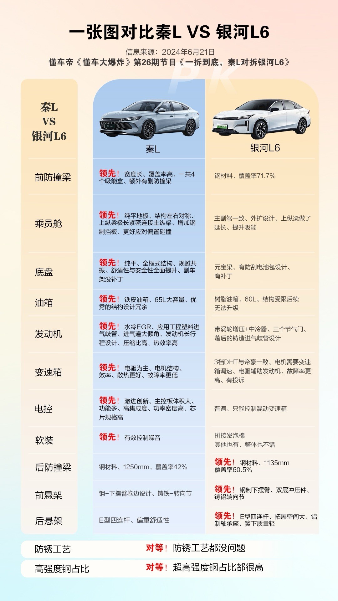 6月21日,懂车帝的《懂车大爆炸》节目围绕“秦L 和银河L6” 两车进行了详细对拆。这次的拆解分别从3个大项进行,包括安全设计、用料、动力总成,以及13个小项,可以说对秦L和银河L6做了个“一拆到底”。