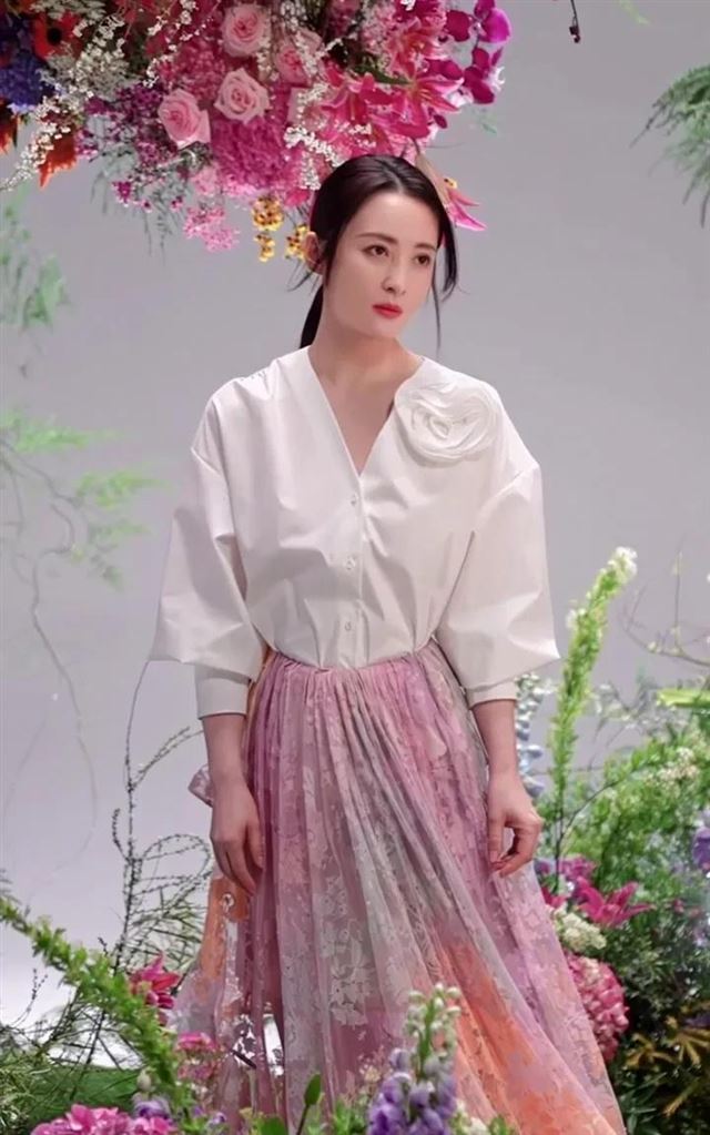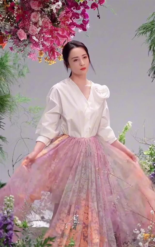 蒋勤勤站在一片繁花似锦的花园里,白色的衬衫搭配着粉色的纱裙。