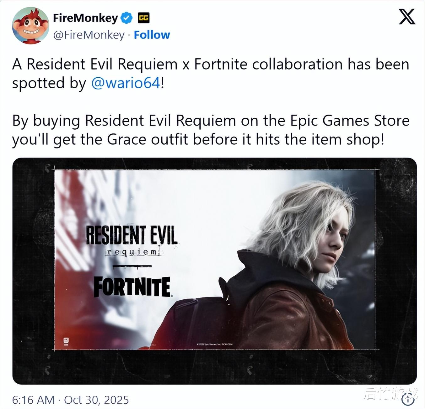 最近,Epic Games通过游戏商城正式公布了《堡垒之夜》跟《生化危机9》的联动活动,在Epic商城预购了生化9的《堡垒之夜》玩家将获得一份礼物,其中包括主角格蕾丝的皮肤。公告还表示有更多内容即将登陆《堡垒之夜》,但未透露开放日期。当然,最有可能跟生化9的发售日2月27日同步。