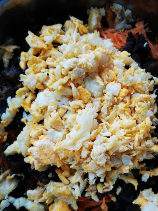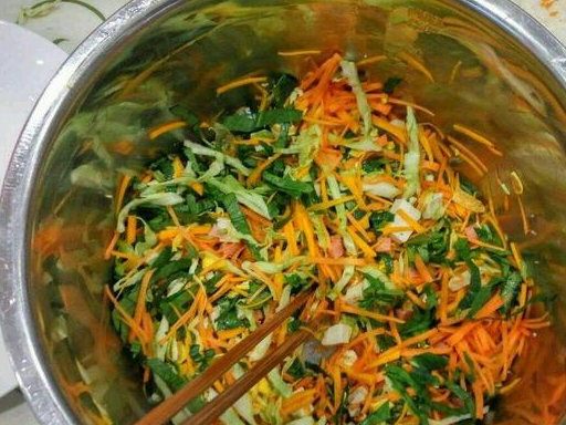 这个更简单了,什么菜都可以放,可以根据的喜好,放不同的菜。里面必备的有鸡蛋、豆腐、粉条、胡萝卜。比较常见的菜就是韭菜、土豆、白菜、刚白菜等等,你喜欢吃什么菜就放什么。在所有菜混合之前,我们要把粉条先泡好,用油炒出来,一反一正就可以,最后泼上味达美,盛出备用。鸡蛋、胡萝卜都可以也先炒出来备用。