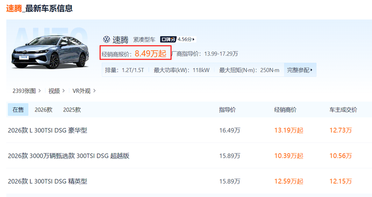 在燃油家轿市场,大众速腾始终是A+级细分领域的“常青树”,既是一汽-大众的战略核心车型,更是无数家庭用户的务实之选。面对新能源渗透率攀升的市场环境,速腾一边抗衡轩逸、卡罗拉等合资竞品,一边以终端优惠对冲新能源车型的政策优势,成为传统燃油车市场的中坚力量。