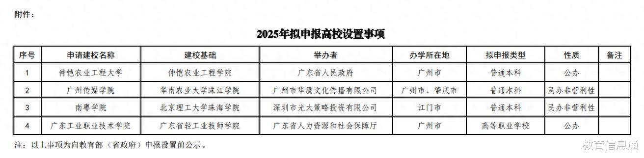 10月10日,广东省教育厅发布《关于2025年拟申报高校设置事项的公示》,拟向教育部申报仲恺农业工程学院更名为仲恺农业工程大学、华南农业大学珠江学院转设为广州传媒学院、北京理工大学珠海学院转设为南粤学院、以广东省轻工业技师学院为基础设立广东工业职业技术学院。