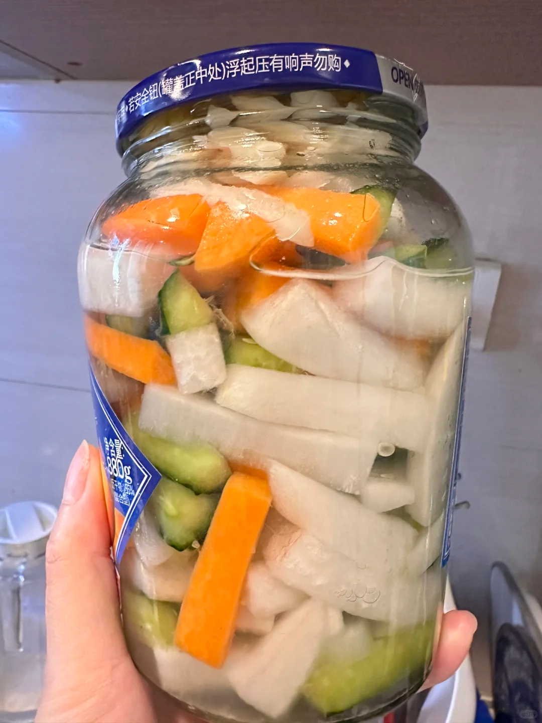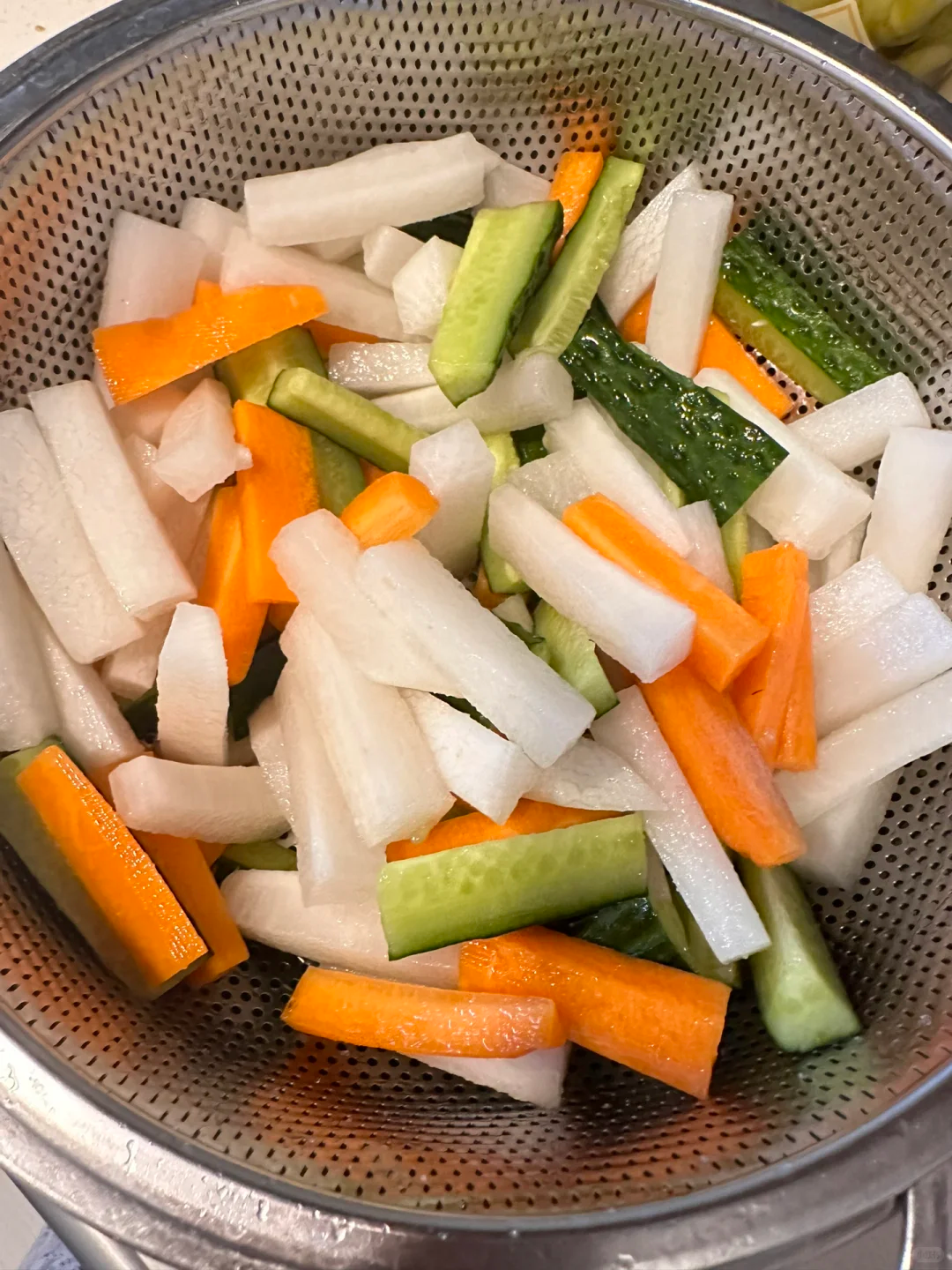 将萝卜和黄瓜切成条之后腌30分钟左右,控好水分,放入罐头瓶当中,加入一勺盐,两勺糖,一勺味精搅拌均匀,
