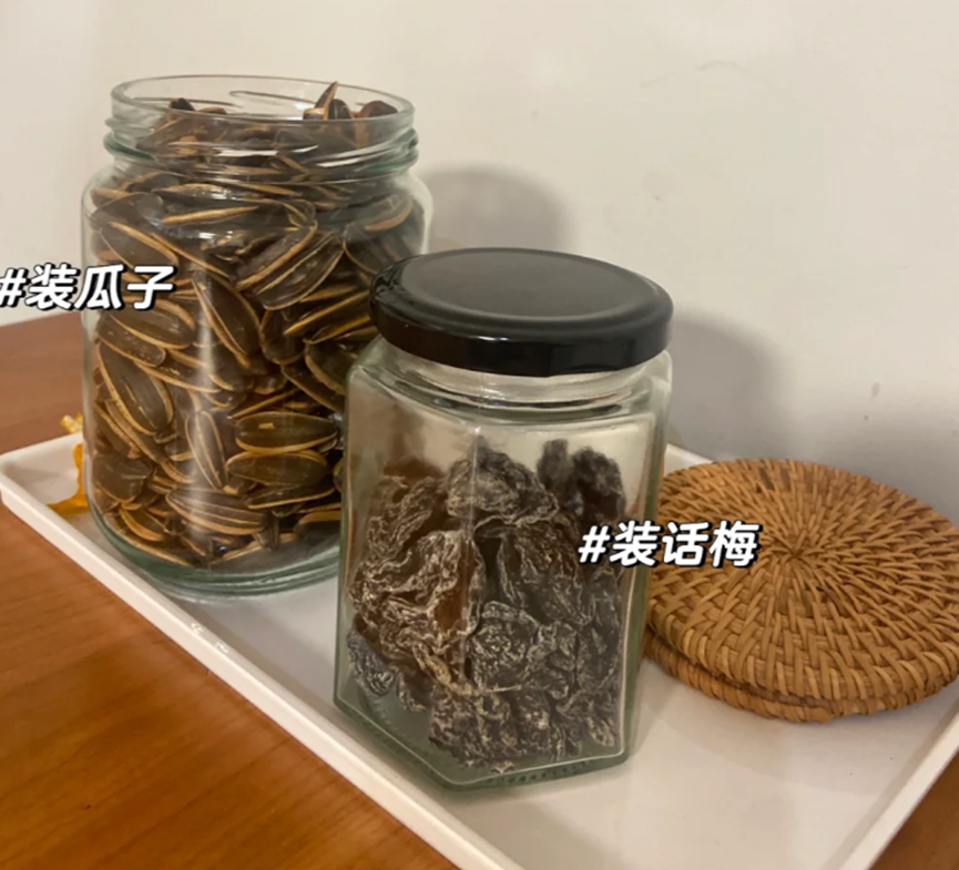 等罐头瓶里的水分彻底干透之后,就可以用来装瓜子或者是话梅等小的零食了,直接就变成了非常实用的零食收纳瓶。