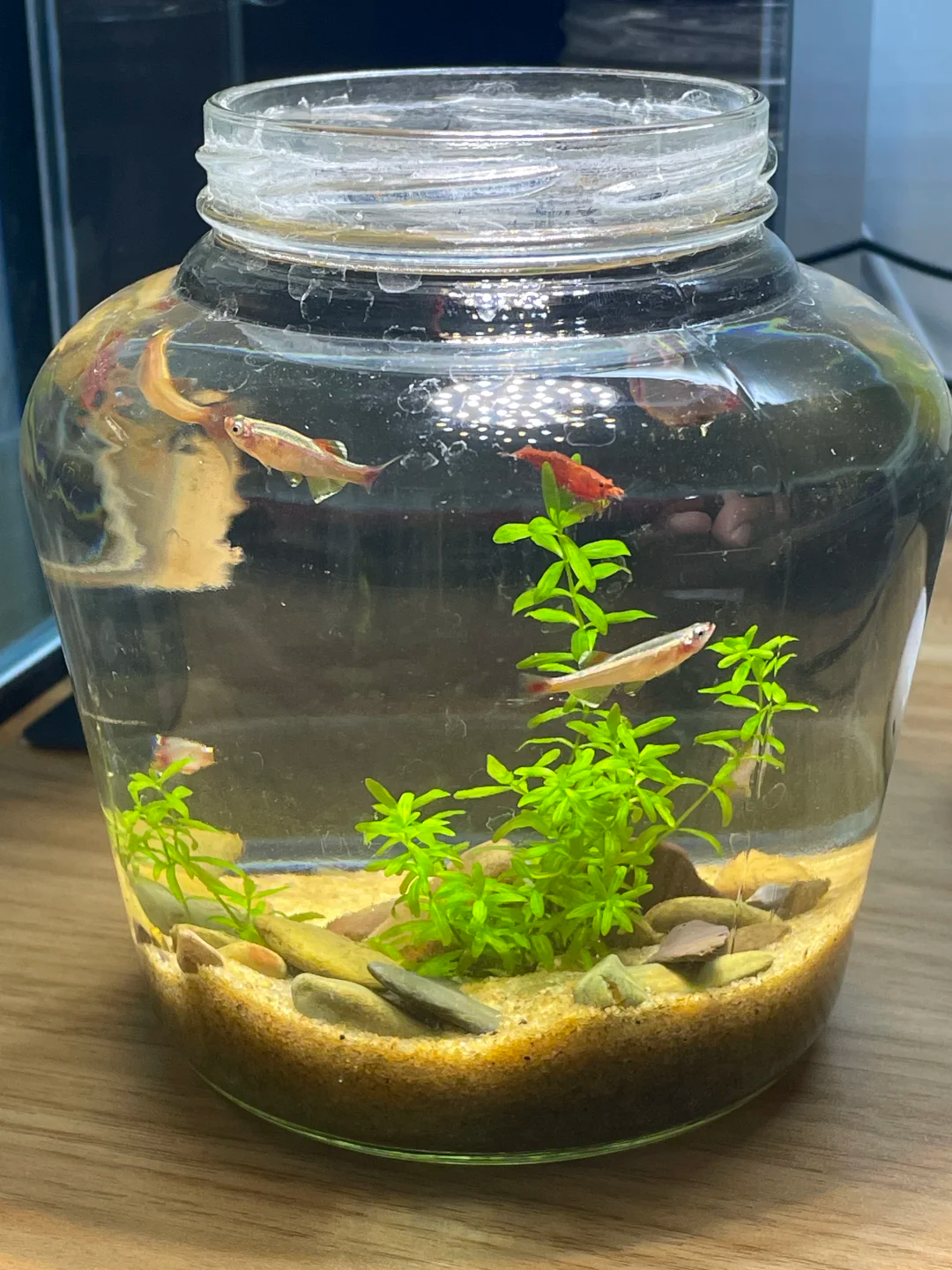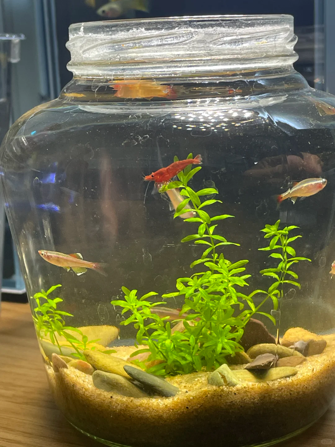 只需要在罐头瓶的底部铺上一层细沙,再摆上几颗小石子,准备一点水草和小鱼小虾就可以变成一个迷你版的水底世界了。