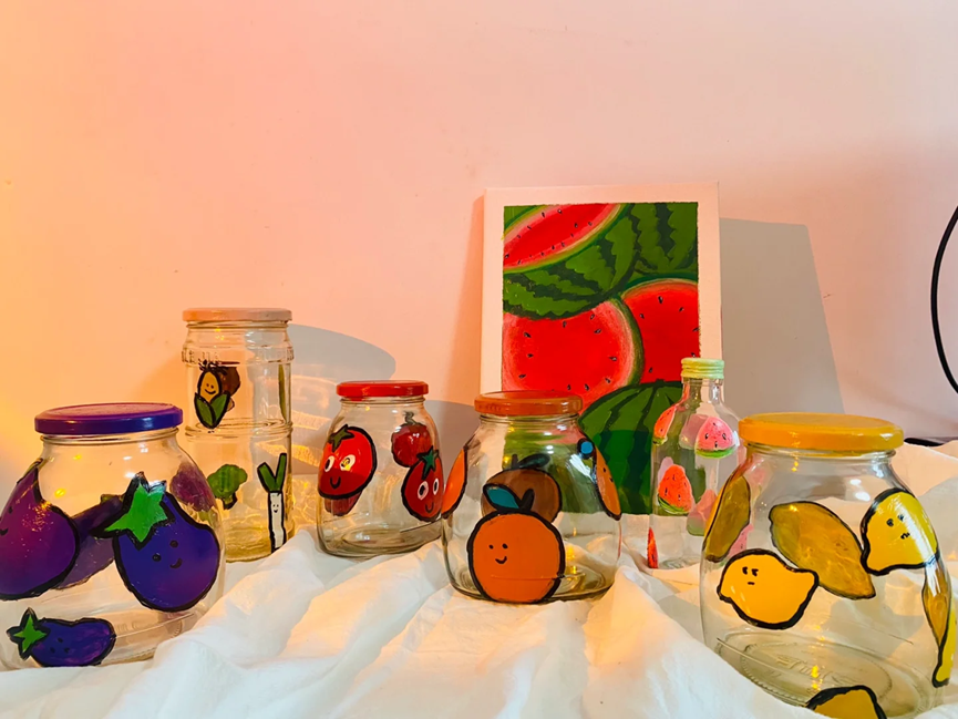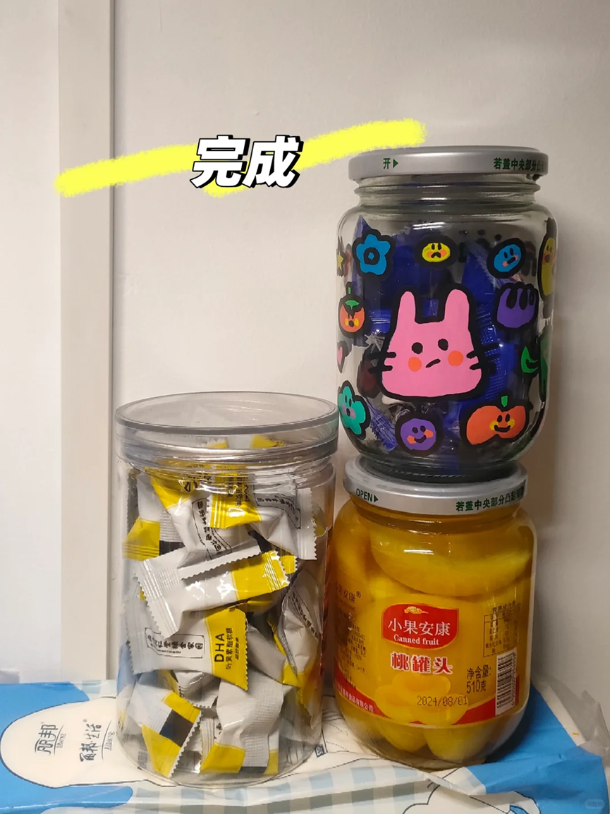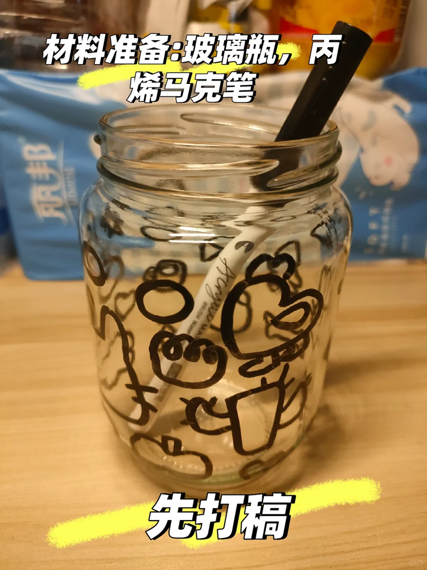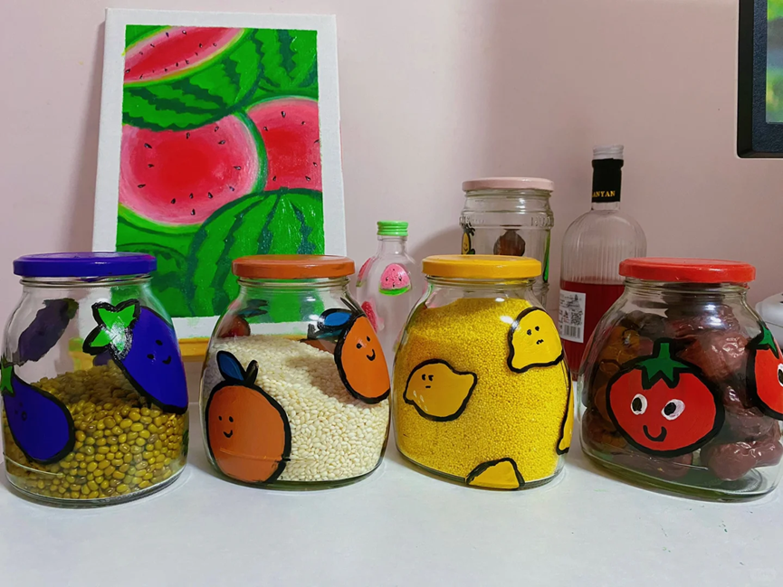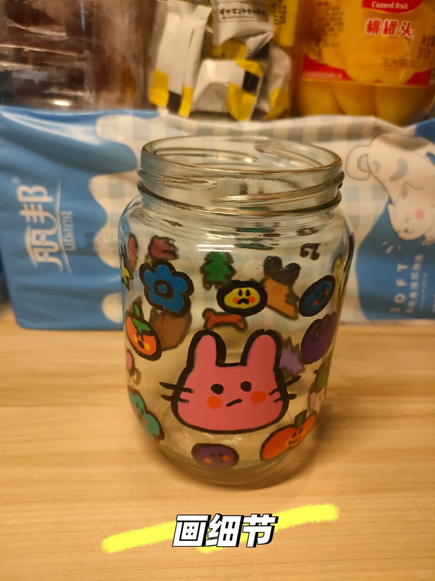 只需要提前准备好洗干净的玻璃瓶和丙烯马克笔就可以了,使用丙烯马克笔在罐头瓶子上描绘出自己想要的图案并进行填色。