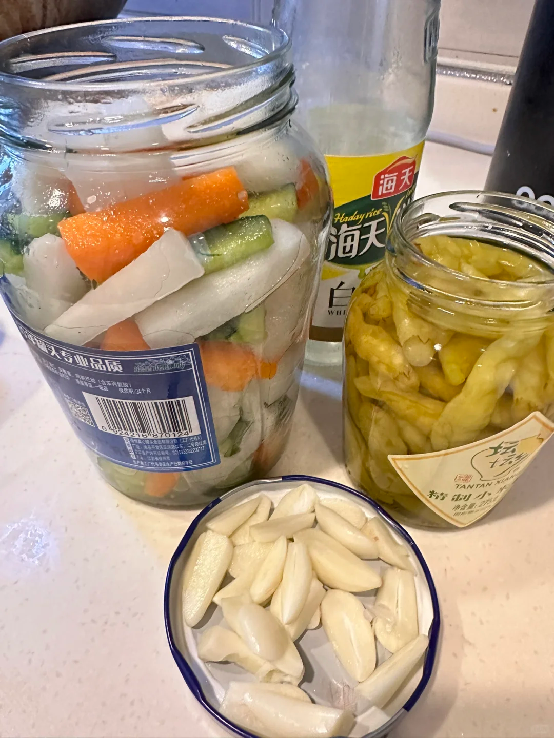 再适当的放入蒜片,泡椒米醋和泡椒水,加上一点白开水到八分满的位置,盖上盖子放入冰箱冷藏一夜之后就可以得到脆脆的咸菜了。