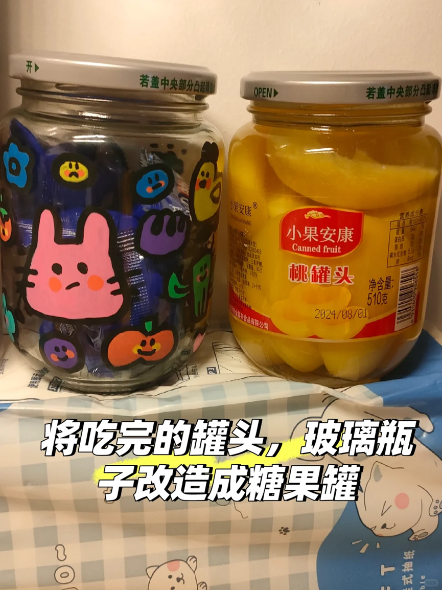 吃完罐头时所剩下来的瓶子,大家可以将其表面的标签撕掉,清洗干净之后自己制作一个特别漂亮的糖果罐。
