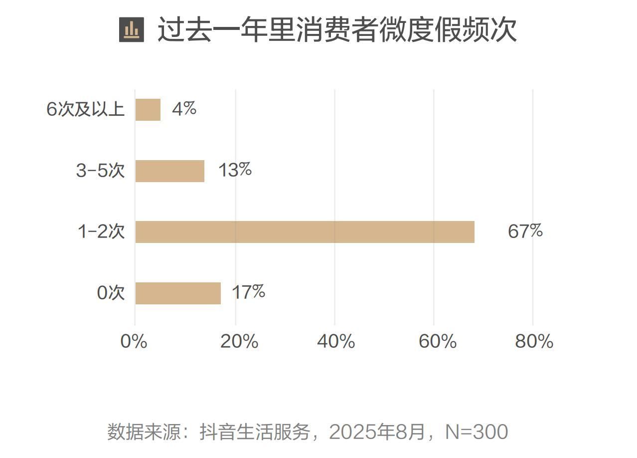 本地微度假:都市人的“去班味”救赎,酒店成短途放松核心场景。职场压力的持续叠加,让“高频、短途”的本地微度假成为都市人常态化的疗愈方式。在过去一年中,83%的消费者有微度假(1-3天短途游)经历,其中67%每年1-2次,17%的消费者每年微度假3次及以上。