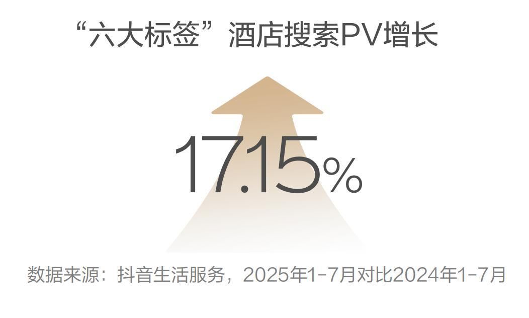 六大标签让酒店更吸睛。抖音通过“六大特色标签”构建内容营销生态,推动特色生活方式酒店实现“流量-转化-增长”的闭环突破。从数据看,抖音持续释放魅力,“六大标签”酒店激活用户主动搜索稳定增长。2025年上半年,六大标签酒店总搜索PV较2024年同期增长17.15%。