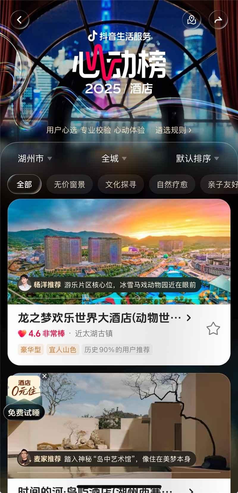 经过抖音生活服务的广泛调研与专家评审,发现消费者更倾向于“上抖音”寻找与发现“特色酒店体验”。抖音数据显示,当前最受消费者喜爱的特色生活方式酒店已形成六大核心偏好标签,分别为“无价窗景”、“文化探寻”、“自然疗愈”、“亲子友好”、“当地风情”以及“品质商旅”。这些数据精准勾勒出“心动榜酒店”的画像——能满足用户视觉震撼、文化共鸣、身心放松、家庭省心等核心需求,为用户带来“真实美好,惊喜连连”的体验。