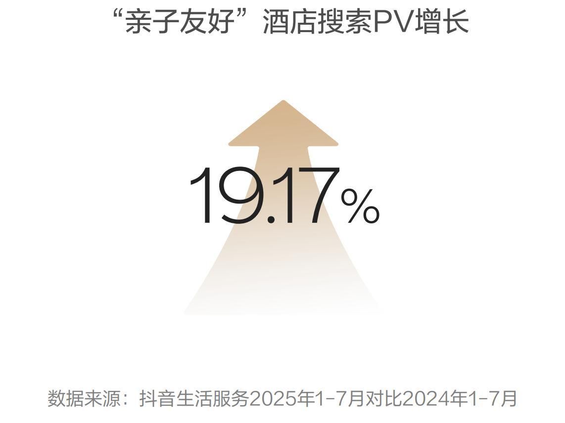 亲子友好:家庭出行的“省心解决方案”。当前,带娃家庭在抖音平台挑选酒店时,对酒店的功能定位已突破传统“住宿空间”范畴,转而将其视为“全家欢乐体验的省心解决方案”。从抖音平台数据来看,“亲子友好”主题酒店的市场表现尤为亮眼:2025年上半年,该主题酒店搜索量较上年同期增长19.17%;尽管相关视频数量仅占生活方式酒店总视频量的8.01%,但其播放量占比达12.4%,展现出较高的用户关注度。