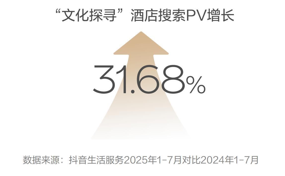 文化探寻:深度体验在地文化,感受历史的活态传承。年轻消费群体在抖音平台挑选酒店时,尤其愿意为文化体验买单。而“文化探寻”类酒店的核心价值,正在于以在地文化为内核,通过深度体验场景的打造,让年轻人在住宿中感受历史的活态传承。抖音平台数据凸显了“文化探寻”类酒店的市场活力:2025年上半年,该主题酒店搜索量同比增长31.68%,增幅仅次于“无价窗景”。