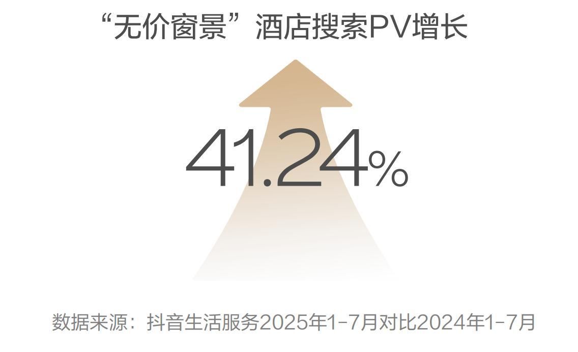 无价窗景:视觉震撼带来梦幻体验。数据显示,消费群体对“窗景”的关注度极高。对该群体而言,酒店窗户如同天然取景框,承载了其对旅行场景的美好期待。从数据层面来看,2025年上半年抖音平台“无价窗景”相关的主题酒店搜索量较上年同期增长41.24%,在特色生活方式酒店相关热搜中位列第一。