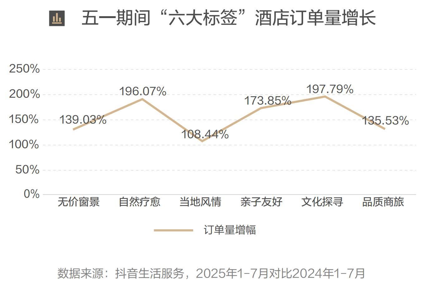 全年增长态势稳定,打破酒店“看天吃饭”。从淡旺季来看,六大标签酒店节假日与淡季均实现高增长。2025年五一期间,亲子、疗愈系最受欢迎:“文化探寻”(197.79%)、“自然疗愈”(196.07%)订单增幅近2倍;而在淡季(3-4月),随着反向错峰需求爆发,“自然疗愈”达219.35%,“文化探寻”达209.96%,印证“错峰出行+特色体验”成淡季消费新逻辑。