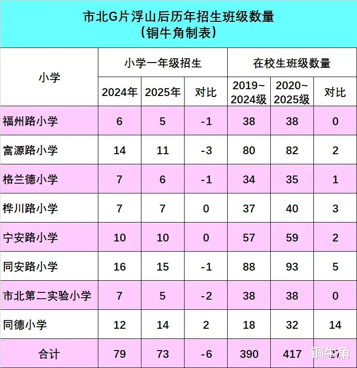 市北G片浮山后7所公办小学、1所民办小学2025年招生班级总数量为73个班,在2023年历史性地达到了88个班之后,2024年降为79个班之后,2025年再次下降。