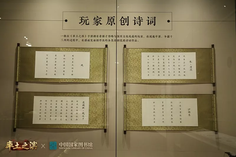 有的玩家文采斐然,写的文言檄文、诗词歌赋,水平高到被国家图书馆收藏,还上了央视报道。比如在国家图书馆建馆110周年的相关活动中,就专门展出了《率土之滨》玩家创作的一系列文言作品。玩家们用笔墨抒发自己对三国文化的理解和热情。