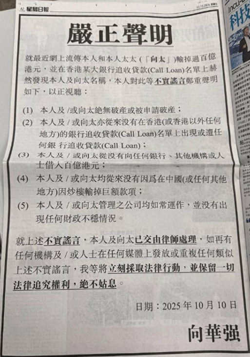 10月10日,向华强发布声明,否认了关于他与妻子陈岚(向太)因炒楼亏损超百亿港元、遭银行追债或申请破产的网络传闻,并表示将采取法律行动。