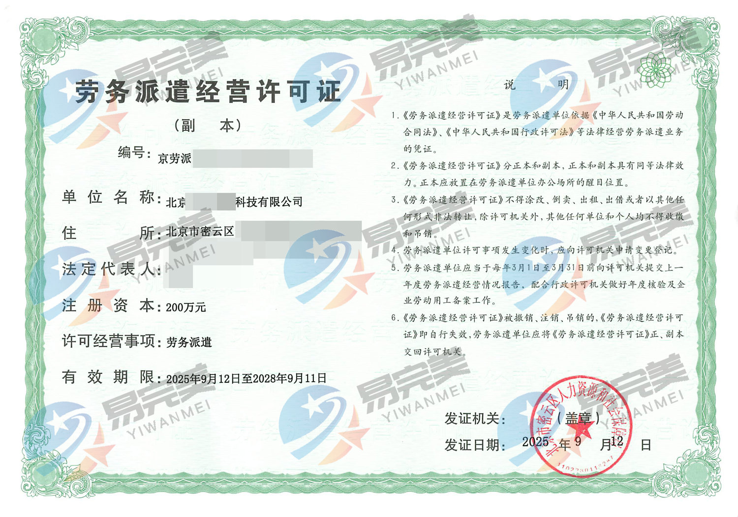 北京新下2025年09月12日劳务派遣经营许可证