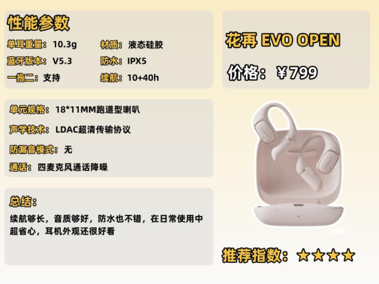 用的是高弹柔软的液态硅胶,摸着手感好,戴久了也舒服;耳挂有四档可以调,能适应不同的耳型,调好了戴着很稳;防水能有IPX4 级,出汗或者下小雨都不怕;单只 10 克,戴着没负担,运动的时候也能贴得很牢。