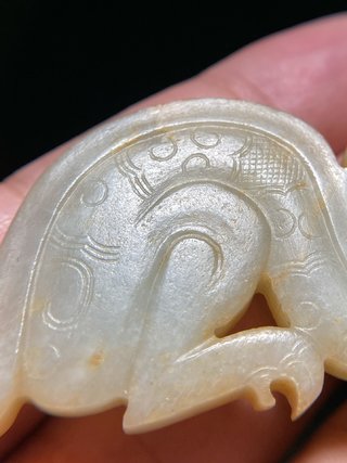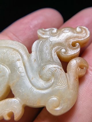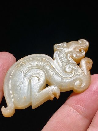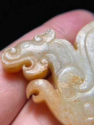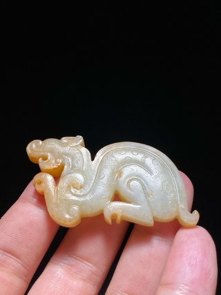 汉 和田玉籽料 白玉受沁 螭虎 虎形佩 玉佩 挂件 长6宽0.7高3.4厘米 重23.8克 和田籽料玉制佩,玉质致密莹润,带黄褐色深沁,器作片状虎形,螭虎身体卷曲,杏眼,弯角。体态活泼逼真。虎是四方灵兽之一,也是百兽之王。长期以来被视为权力和力量的象征,亦被认为能驱除一切邪恶。东汉.应劭《风俗通义.祀典》:「虎者,阳物,百兽之长也。能执搏挫锐,噬食鬼魅。」更寄寓着向往吉祥幸福的祈佑观念。