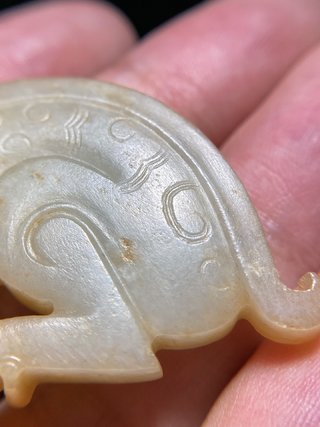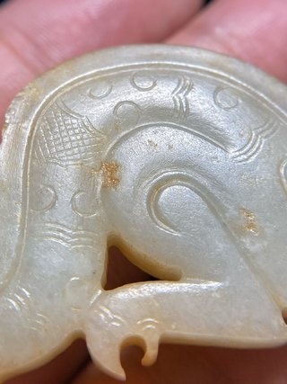 汉 和田玉籽料 白玉受沁 螭虎 虎形佩 玉佩 挂件 长6宽0.7高3.4厘米 重23.8克 和田籽料玉制佩,玉质致密莹润