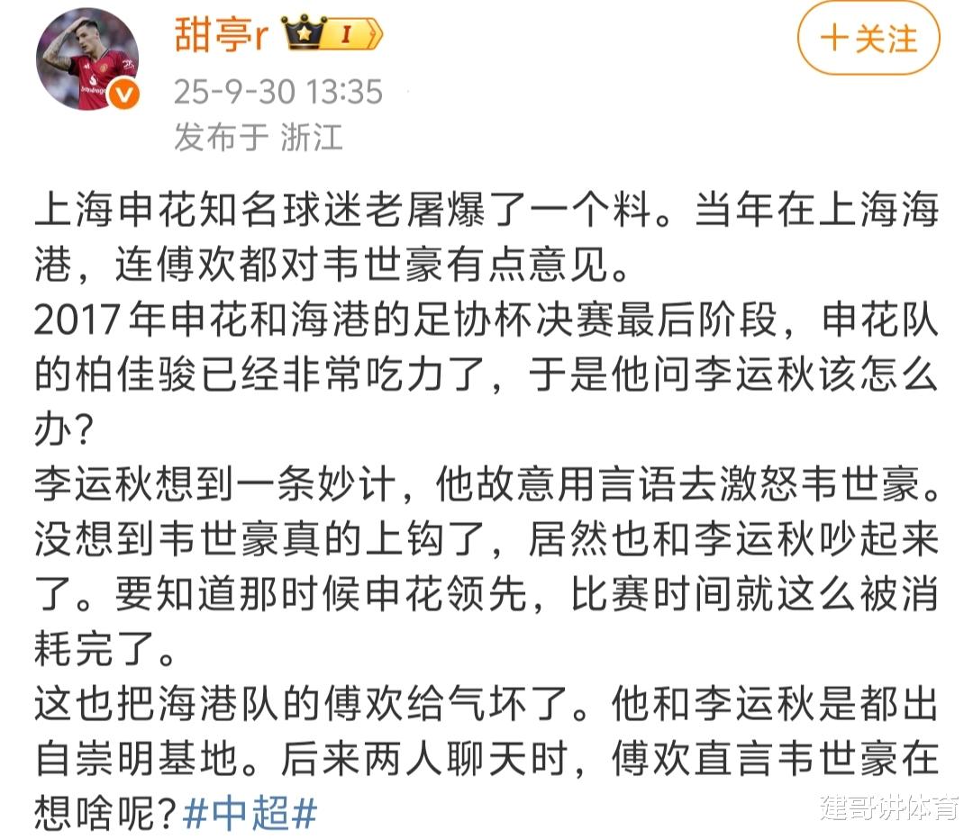 当韦世豪的脾气不容易控制后,知名大V更是爆料出当年韦世豪影响到了海港队夺冠的消息,这位大V称2017赛季效力海港队的韦世豪,在足协杯决赛的比赛过程中,中了对手上海申花的计策,上海申花成功的抓住韦世豪脾气大的特点,成功的在海港队手里抢走了足协杯冠军。