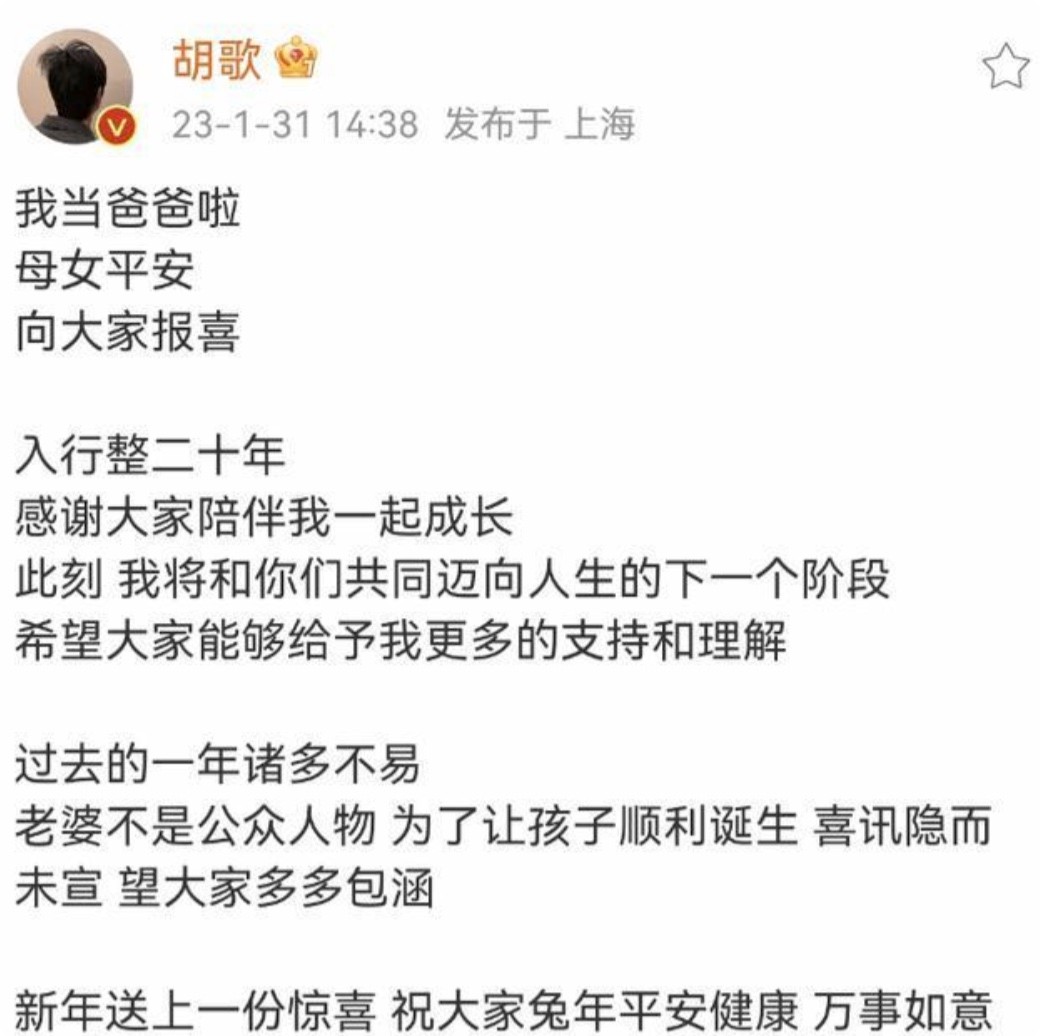 2023年1月31日那天,胡歌的微博只发了短短一句话:“我当爸爸啦,母女平安。”