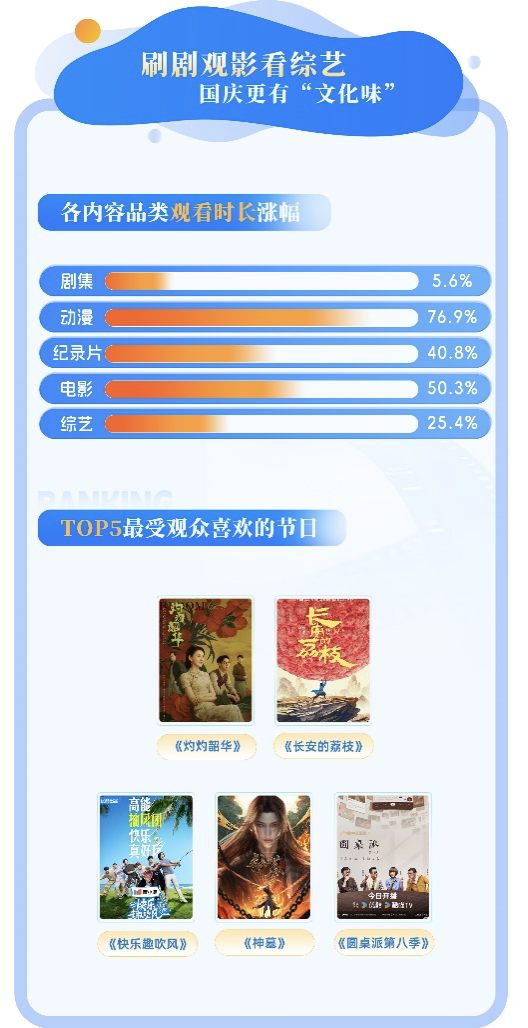 此外,《灼灼韶华》《绝命法官》等剧集、《快乐趣吹风》《百厨大战》等综艺,以及动漫《神墓》《云深不知梦》等多类型作品同样受到观众喜爱。优酷工作人员表示,国庆期间,除了传统的追剧观影刷综艺,更多观众倾向于有深度、有思想的文化类节目,也热衷体育赛事等新兴热点,这种多元化需求推动了线上内容的百花齐放。