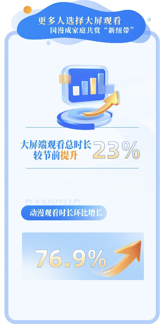 线上文娱:大屏观看成假日主流,观看时长环比提升23%假期的线上文娱消费则呈现大屏化、沉浸式趋势。报告显示,国庆期间优酷观看时长增长主要来自大屏端,环比节前一周上涨23%。动漫、电影、综艺、纪录片四大品类涨幅最大,动漫类节目以76%的涨幅位居榜首。优酷工作人员分析称,以新国风为代表的国漫内容正在重塑客厅文化。随着80、90后成为父母,优质的国漫作品正成为连接两代人的娱乐新纽带。
