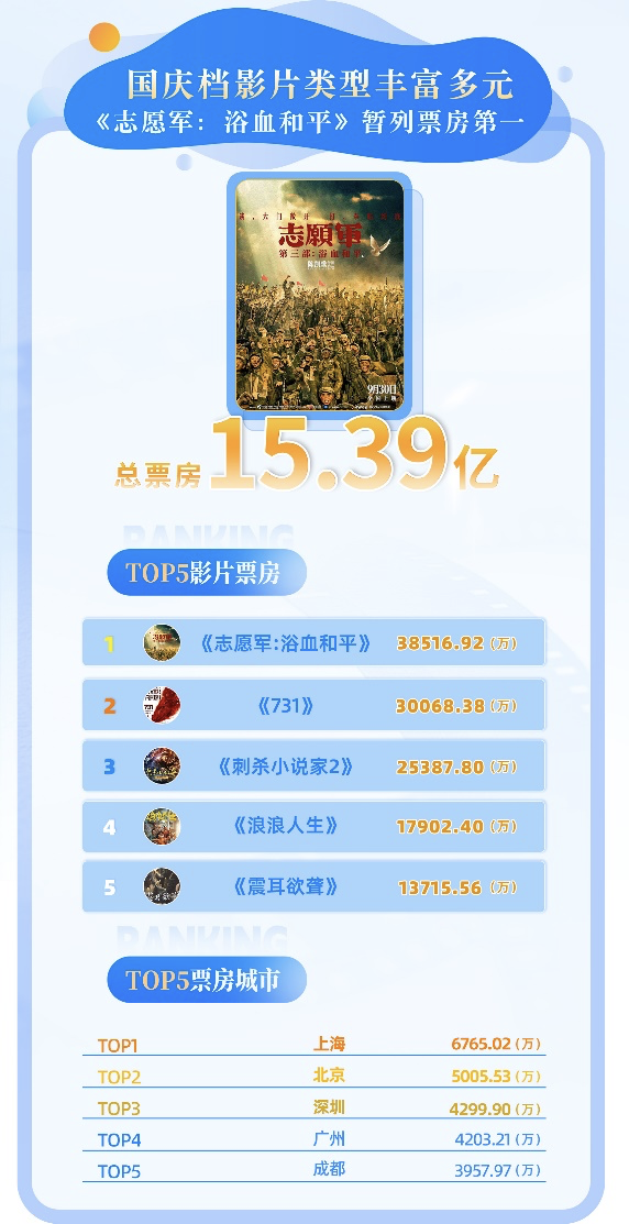 今年国庆档电影市场持续火热。大麦娱乐数据显示,前6天总票房达15.39亿元。《志愿军:浴血和平》《731》《刺杀小说家2》《浪浪人生》《震耳欲聋》暂列票房前五名,各片档期内票房均突破1亿元。