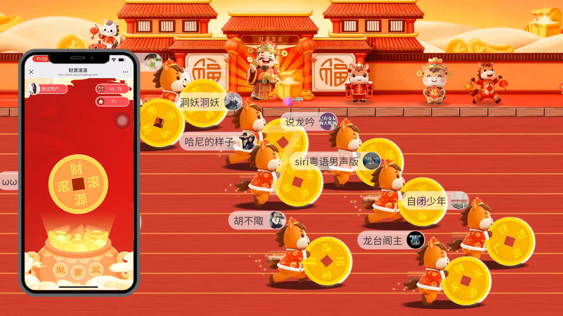 新的一年,大家都想财源滚滚,这个小游戏的玩法也很简单,参与者只需要点住手机端的金币,随意顺时针或者逆时针转动,转动的速度越快,分数越高,大屏幕上元素推着金币向前进