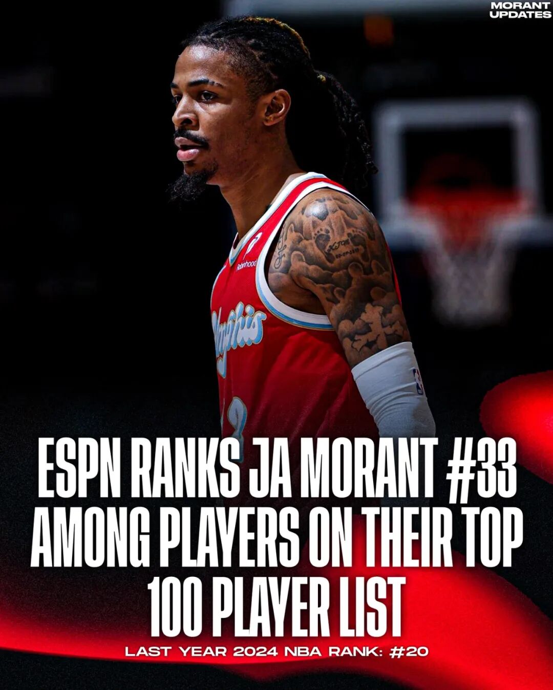 值得一提的是,此前ESPN的新赛季百大球员排名,莫兰特只排在了第33位,作为对比,2022年打出生涯高光后,莫兰特可是在ESPN的百大中名列第9,上赛季他的名次则是第20,新赛季掉到33,多少也能看出来媒体对他的不信任和不看好。
