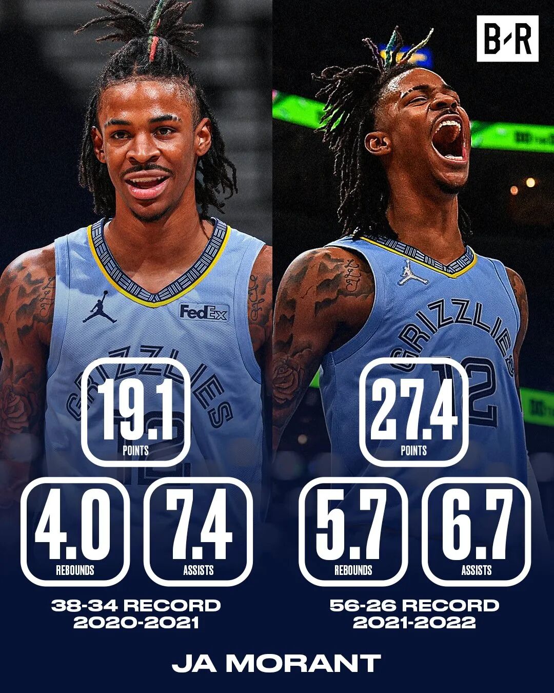 我们会记得,2021-22赛季,三年级的莫兰特带着灰熊突然崛起,那一年常规赛,他场均可以拿到27.4分5.7篮板6.7助攻,投篮命中率49.3%,三分命中率34.4%,真实命中率57.5%。