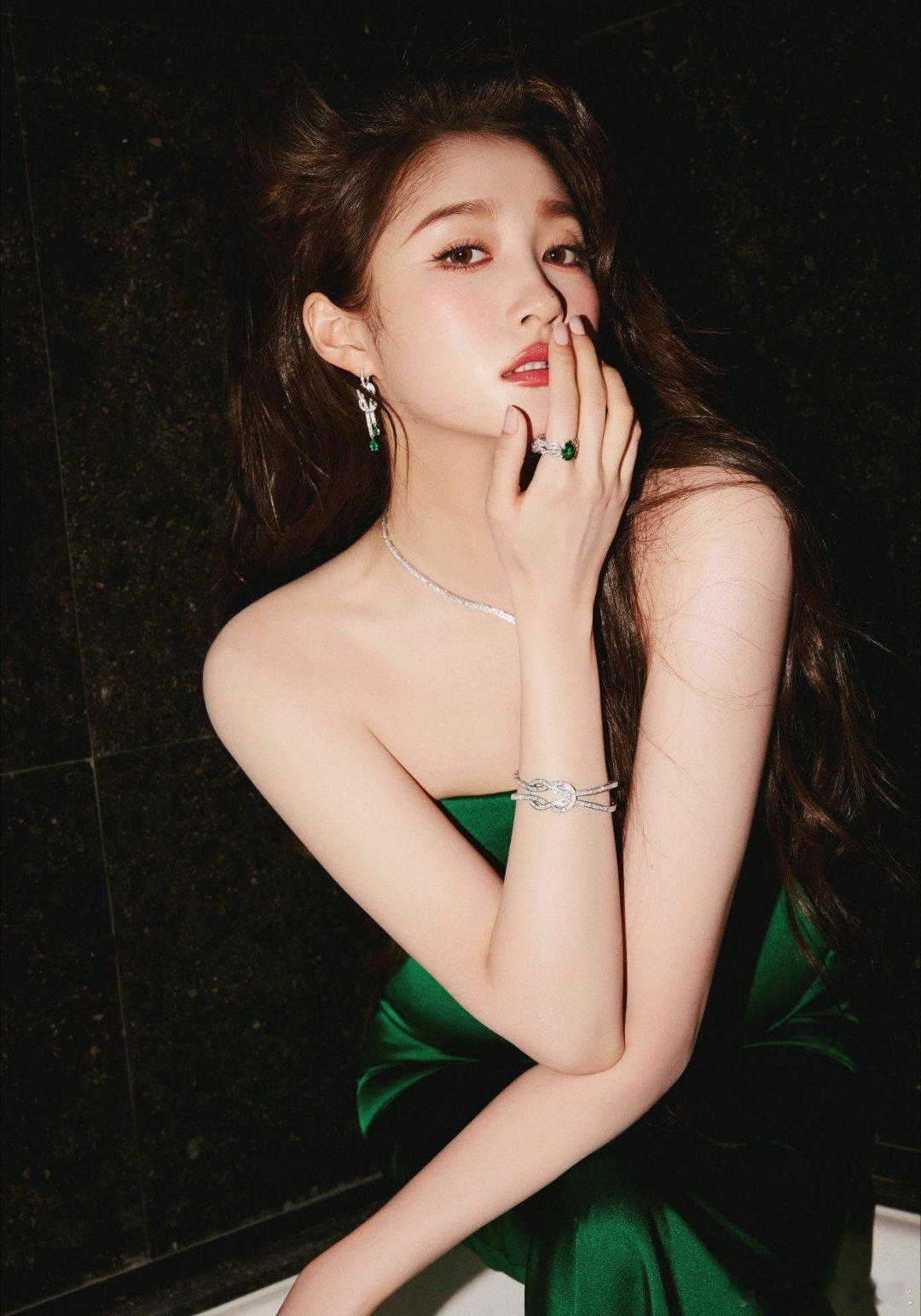 #关晓彤祖母绿高珠# 关晓彤身穿一袭绿色开叉礼服,佩戴祖母绿珠宝亮相上海活动,高
